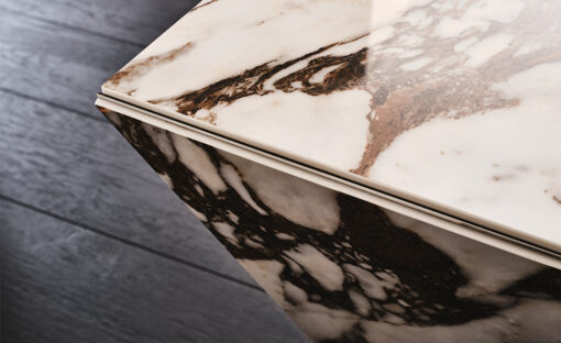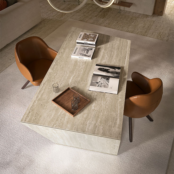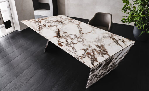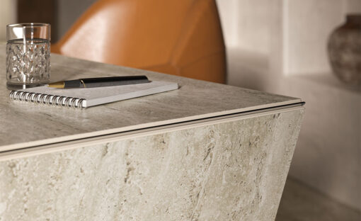 Keramická doska pôsobí kompaktným dojmom, pričom kresba plynulo nadväzuje z hornej plochy aj na bok. Vďaka tomu stôl pôsobí ako jeden celok – pevný, elegantný a vizuálne čistý.