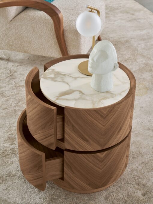 Objavte dokonalú symbiózu prírody a moderného dizajnu v luxusnom nočnom stolíku Haribo. Ručne vyrobený z masívneho dreva s výraznou kresbou a doplnený elegantnou mramorovou doskou. Inovatívny systém skrytých zásuviek ponúka praktické úložné riešenie bez toho, aby narušil čisté línie dizajnu.