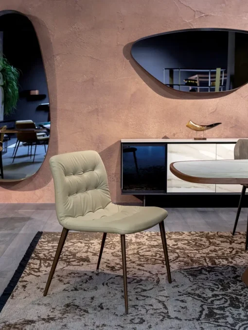 Elegantná stolička DADDY ponúka svojim remeselným spracovaním mäkkosť a pohodlie sedenia.. Každý detail tejto stoličky je vyrobený precízne a starostlivo. Technika capitonné kombinuje povrchovú úpravu kože a látky, čím vytvára harmonický a sofistikovaný celok.