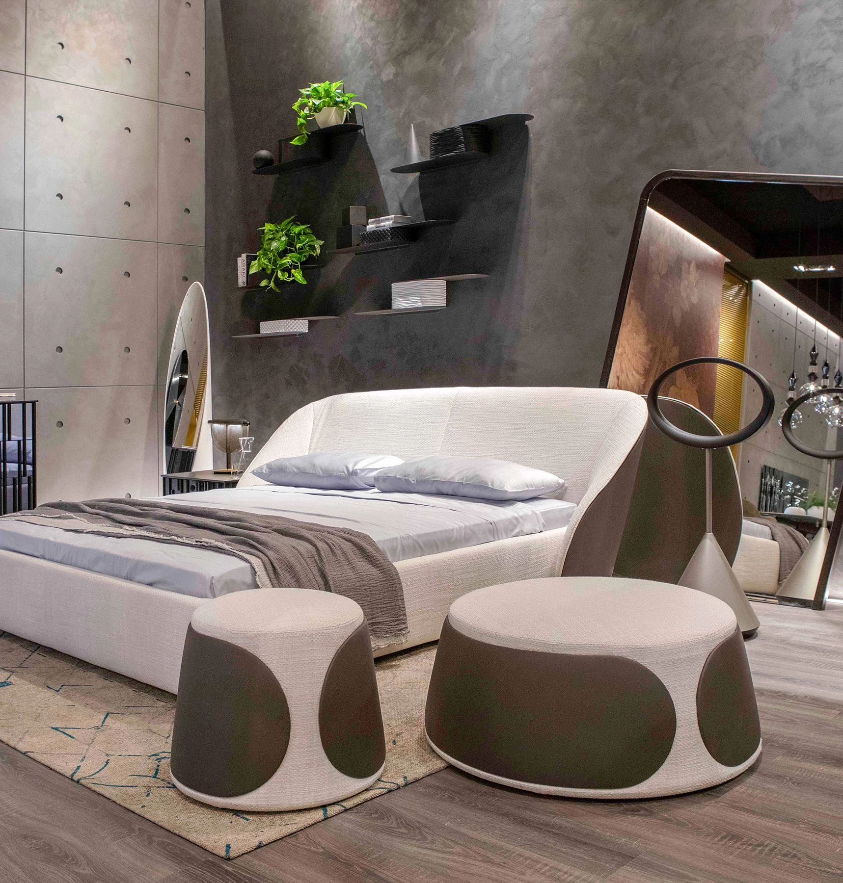 Oblé taburetky s čistým dizajnom, ktoré nepôsobia rušivo, ale prirodzene zapadnú do interiéru. Kombinácia látky a hladkých plôch vytvára príjemný kontrast, ktorý nepôsobí okázalo ale zaujme.